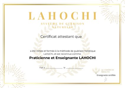 ● Introduit des vibrations de couleur et de santé ● Améliore, dans le champ éthérique, un traitement d’acuponcture ● Charge de vibration les essences florales et minérales ● Équilibre la circulation du fluide crânien dans le cerveau et équilibre le système cérébrospinal ● Ouvre les 21 centres d’énergie du corps ou le système d’anatomie des méridiens ∙ Ouvre les blocages dans les corps d’énergies subtiles ● Ouvre et nettoie le système des chakras ● Réaligne la structure du corps, un système de grille multidimensionnelle qui maintient le corps dans son intégrité ● Dégage les blocages électriques dans l’énergie du corps, semblable à un réseau de lien entre la mémoire cellulaire et le corps physique, afin que l’information puisse passer librement ● Élargit le champ d’énergie ● Place la mémoire divine dans la couche externe du champ énergétique qui transmettra la mémoire divine au corps entier ● Place la mémoire divine dans le champ éthérique dans le but de guérir les déséquilibres ● Active le corps de lumière ● Accélère la guérison et les dons spirituels ● Assiste à atteindre les plus hauts états de méditation ou de conscience possible pour chaque personne dans le moment présent Le LaHoChi peut être reçu seul ou combiné à d’autres soins énergétiques.Ce que comprend la formation LaHoChi